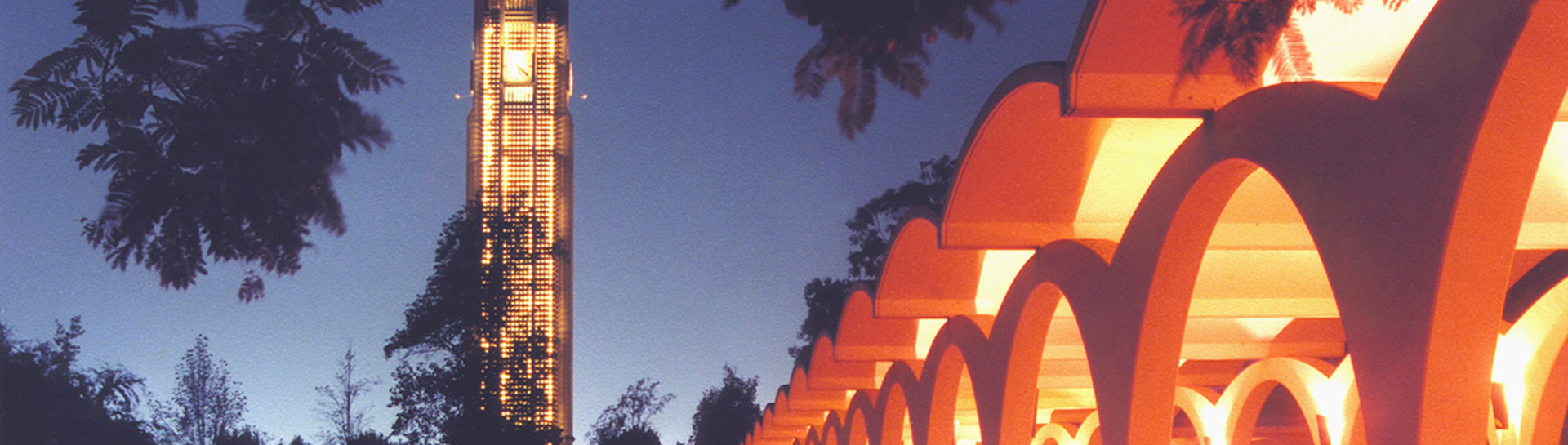 bell tower and Rivera walkway at night (c) UCR 1920x545